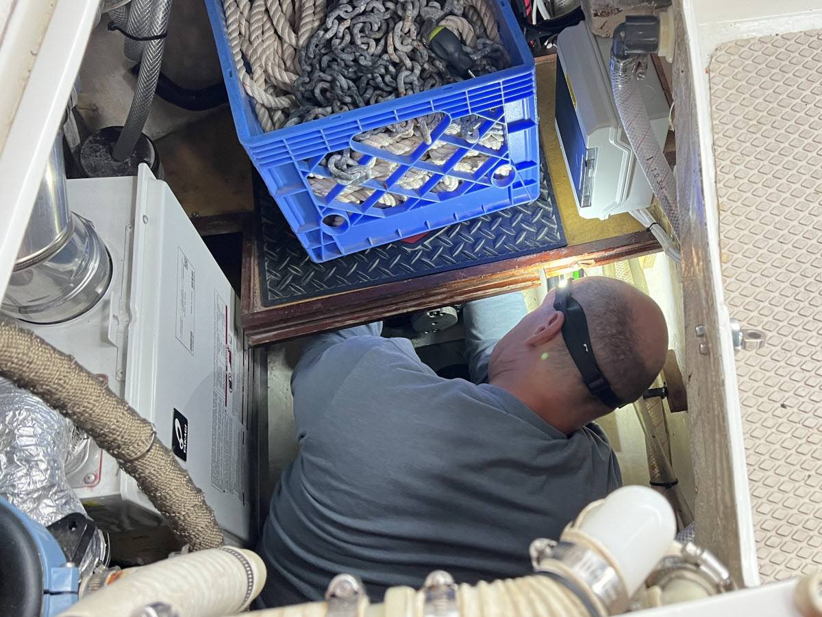 Unfortunately, 3 hours out it failed. I attempted to add more hydraulic fluid to the pump underway which required me to stuff myself deep down in the lazarette while Kathy simultaneously steered Adventure and handed me capfuls of hydraulic fluid. It didn’t fix the problem.