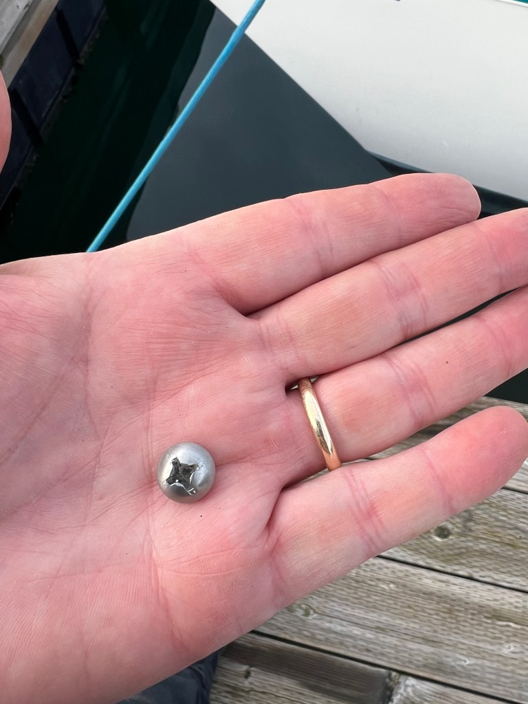 After a lecture about using an electric screwdriver, I grabbed a manual one and ran back up to the bow to redeem myself. I slowly turned the screw and it began to move. Only one screw is broken, I thought. It’s only one screw. But then the head fell off the second screw. Darn It!