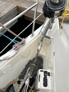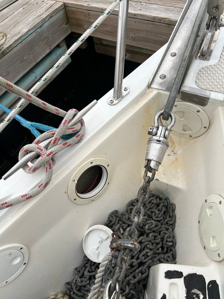 I opened the anchor hatch and reached for the deck plate. It’s round and has two indents for your fingers to turn it. Kathy ignored me, futilely focused on retrieving the bashful nubs of wire. I tried to turn the deck plate but it didn’t move. I pressed with all my might summoning the power of the universe and my finger slipped and banged against something hard. I winced in pain, my eyes began to water. Kathy noticed NOT!