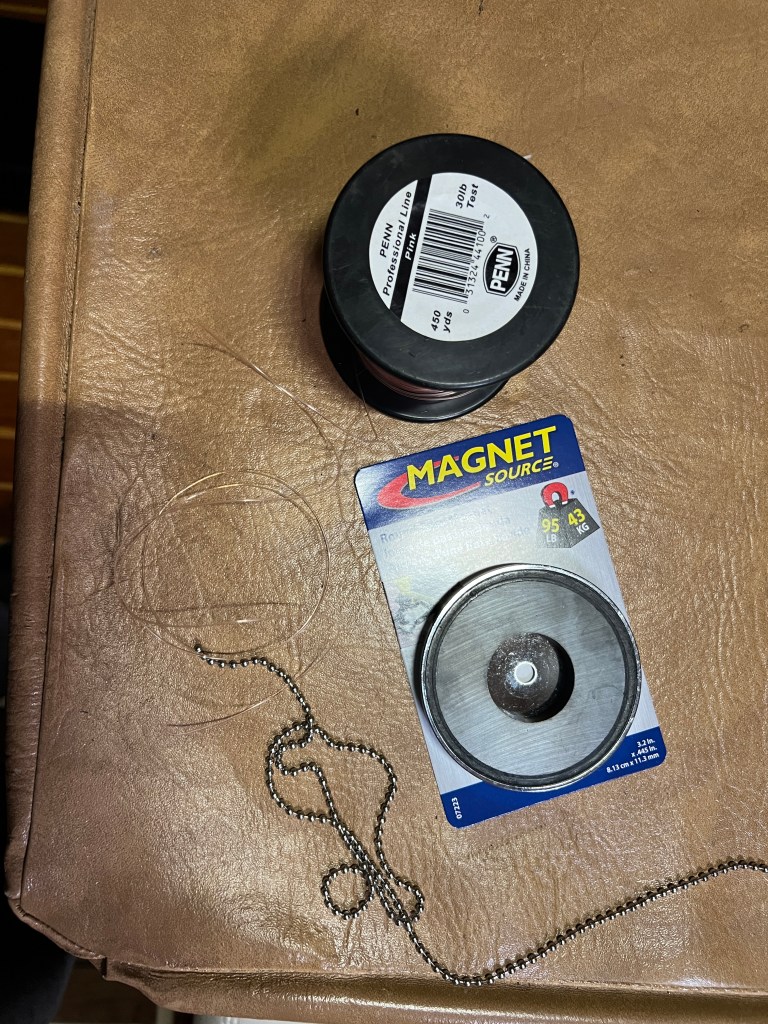Meanwhile, Kathy researched how to run a wire around two turns inside a stainless steel tube. Kathy settled on a magnet, a small section of lamp chain, and some fishing line. She was able to pull the lamp chain with the magnet and pretty easily ran it through the tubing. Soon after we had new wire pulled through.