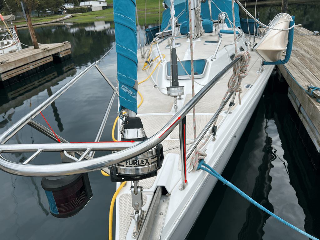 Kathy decided to call it quits mumbling something about the incompetence she had to work with, and went down below. Now I was all alone. I contemplated my next move. It was time to remove the screws holding the leg to the bow pulpit. There were only two of them. But they were from the original factory install, circa 1989.