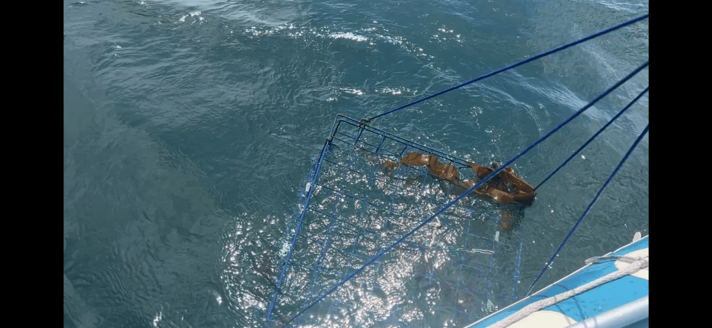 Kathy pulled the trap up and placed it on the pontoon of the dinghy. Nothing! Just a chunk of seaweed. Kathy looked at me in disgust as she grabbed for her can of clams.