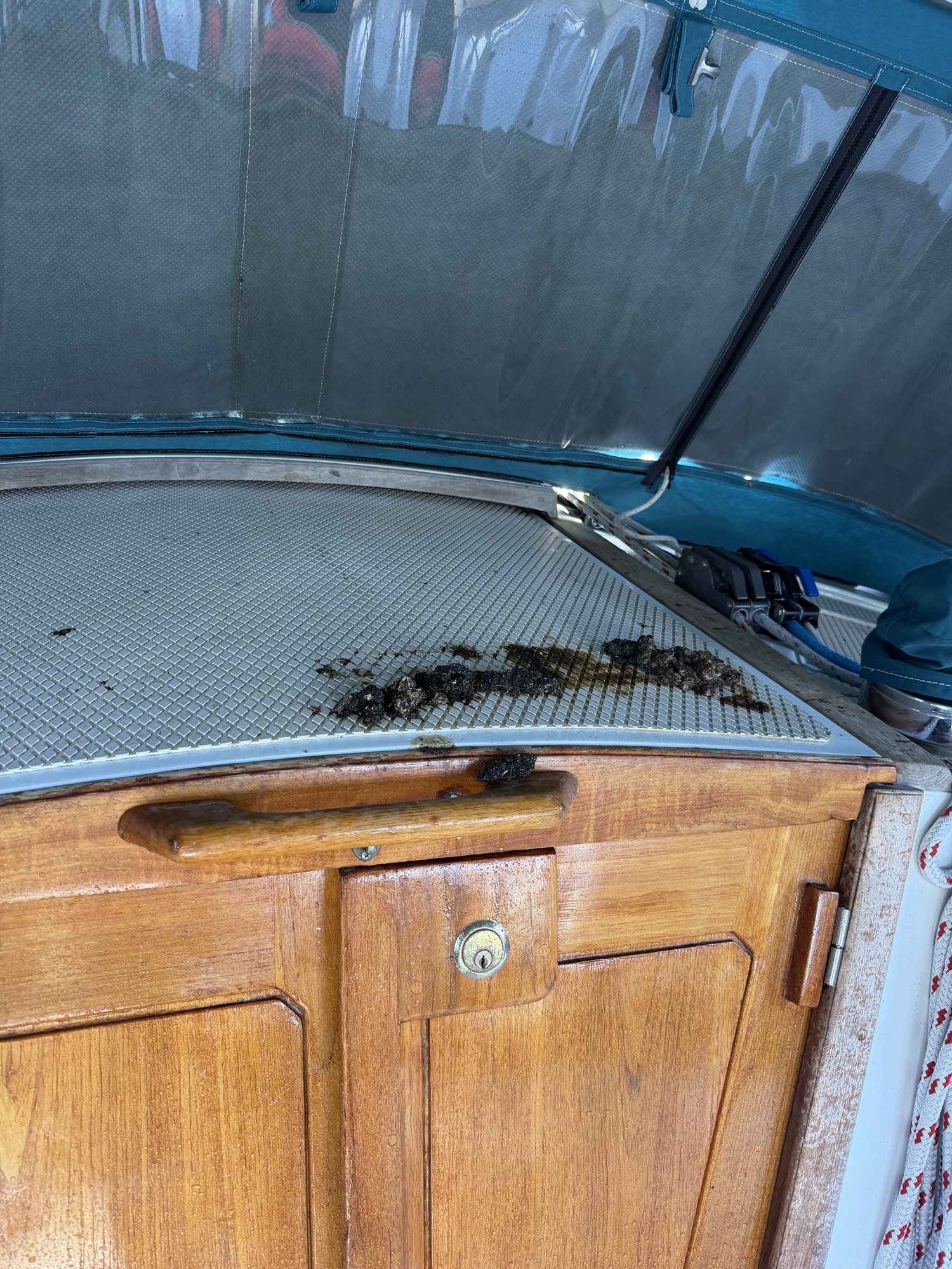 Kathy and I arrived at Adventure yesterday and found that a romp of otters had made our cockpit their throne room. Before we could do anything else we had to get out the hose and scrubbing tools. Kathy said the cockpit still smells like SeaWorld, so more scrubbing today.
